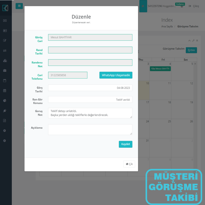 Randevu Takip sistemi müşteri teklif, keşif görüşme ve randevularınızı ayarlar. Randevu takip sistemi müşterilerinizle görüşmelerinizi , teklif durumunu sormanızı, telefonla tekrar görüşme yapmanız gereken saatleri hatırlatır. Randevu takip sistemi, pazarlama faliyetinde saha pazarlama personelleri, telefonla Satış Personelleri , birebir satış personelleri farklı kullanıcı tanımlar Randevu takip sistemi teklif ve keşif görüşmelerinizi , teklifin durumunu sormanız gereken günleri planlamanızı sağlar ve planlanan gün ve saatinde size hatırlatır.
